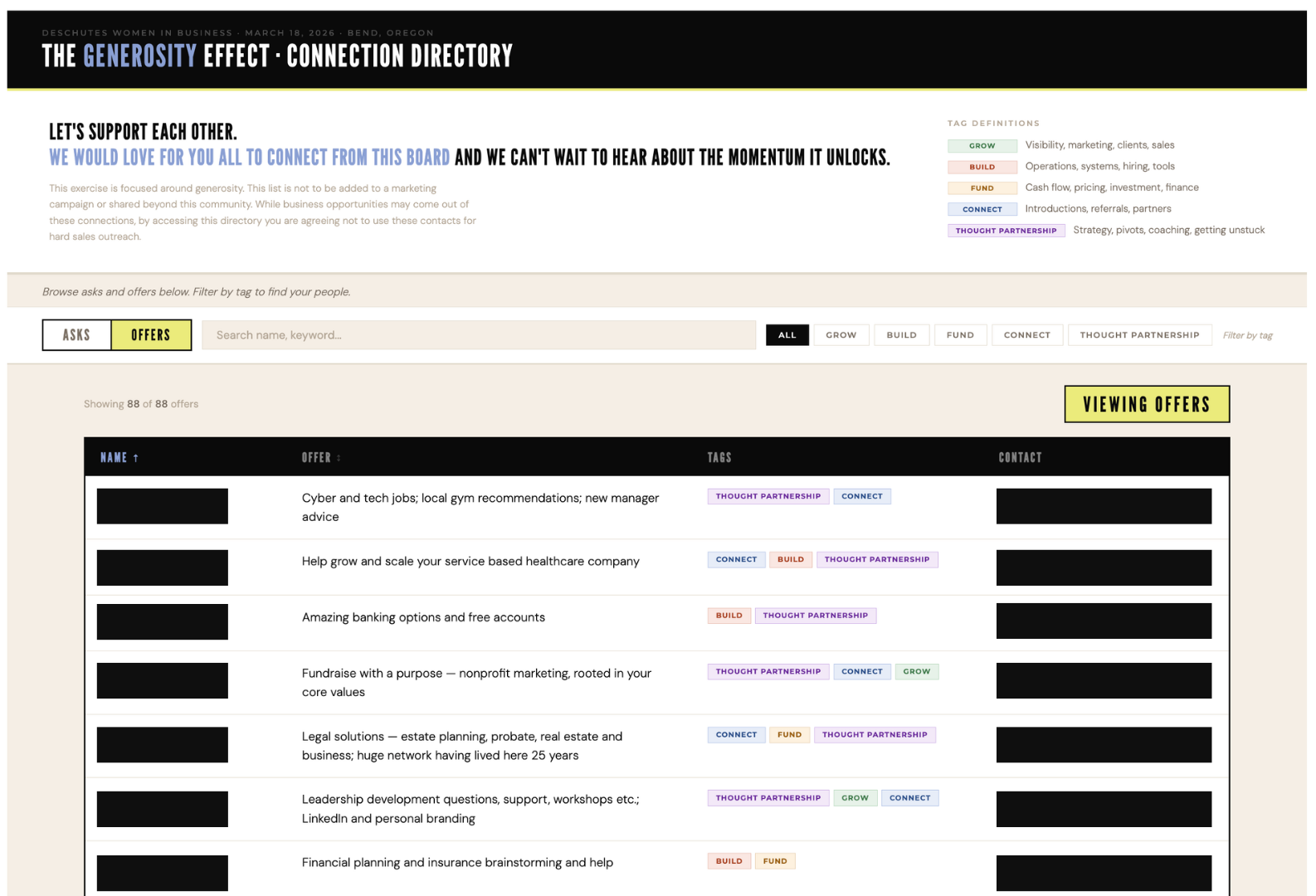 We photographed every single Ask and Offer card from the event and turned them into a searchable, filterable directory, just for the people who were in that room. Browse by what people need, what they can offer, and filter by category. It is all there.